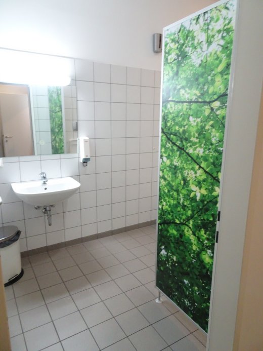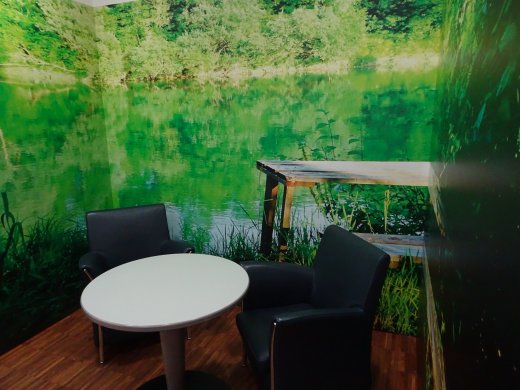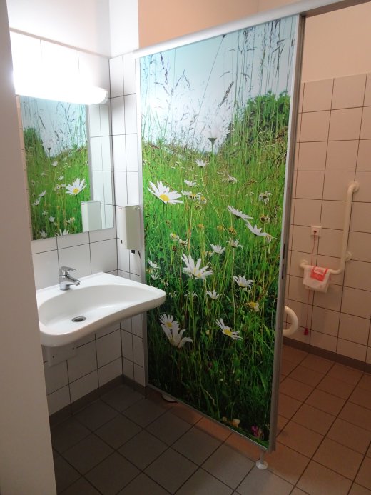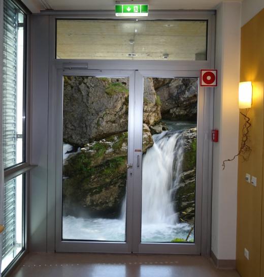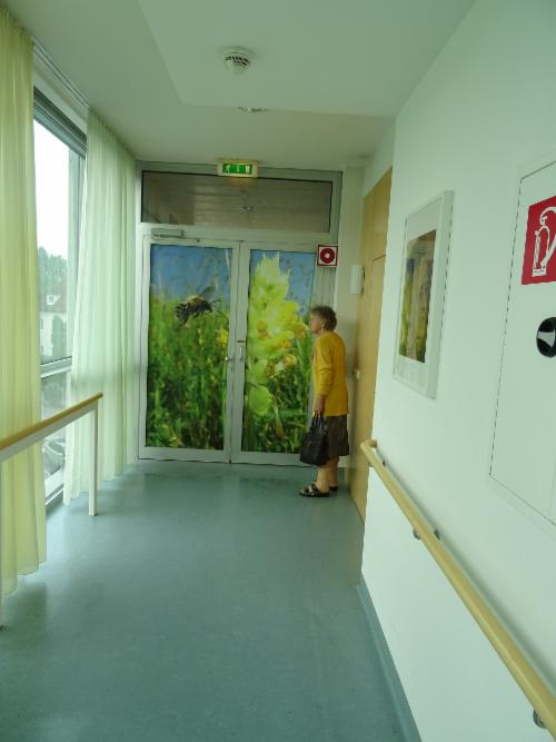 Die offenen Fluchttüren führten zu einem vermehrten Aufsichtsbedarf Die Bio Philia Bilder bieten im speziellen für demente Menschen eine Ausgangsbarriere. Somit führt es zu einer Entlastung des Personals. Der QR Code kann ausgelesen werden und die Stimmen der Natrur von Biene, Hummel und Co. werden hörbar.